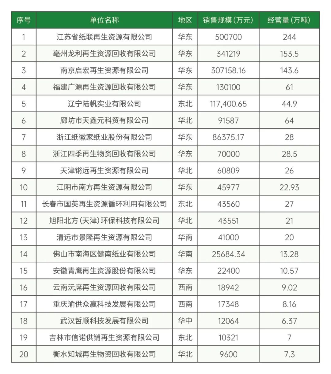 由中国再生资源回收利用协会废纸分会组织的“2019年度回收纸企业经营状况调查”已经结束,本年度有100余家企业参与调研。根据企业实际经营情况,废纸分会认真分析研究编制了《2019中国回收纸行业发展报告》,并根据各个企业年度经营情况排定了“2019年回收纸行业二十强企业榜单”。